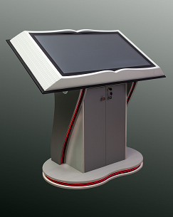 Интерактивная книга на стойке из серии «Кисельковое царство» представляет собой совокупность устройств, взаимодействующих между собой в интерактивном режиме. Изделие применяется в образовательных и культурных учреждениях для информирования посетителей о конкретном учреждении, как справочная информация, как информационный киоск в МФЦ, на входную зону в школах, средних и высших учебных учреждениях, в музеях как аудиогид с трансляцией экспонатов, в библиотеках и театрах как информатор расписания, знаменательных дат и событий. В изделии используется специализированное программное обеспечение для заказчиков. За все операции в устройстве отвечает быстродействующий компьютер персональный компьютер (ПК). На компьютере установлена операционная система Windows 10. В ПК возможно установить любые совместимые с ПО "Windows" приложения. Корпус изделия выполнен из Ламинированная древесно-стружечная плита (ЛДСП).