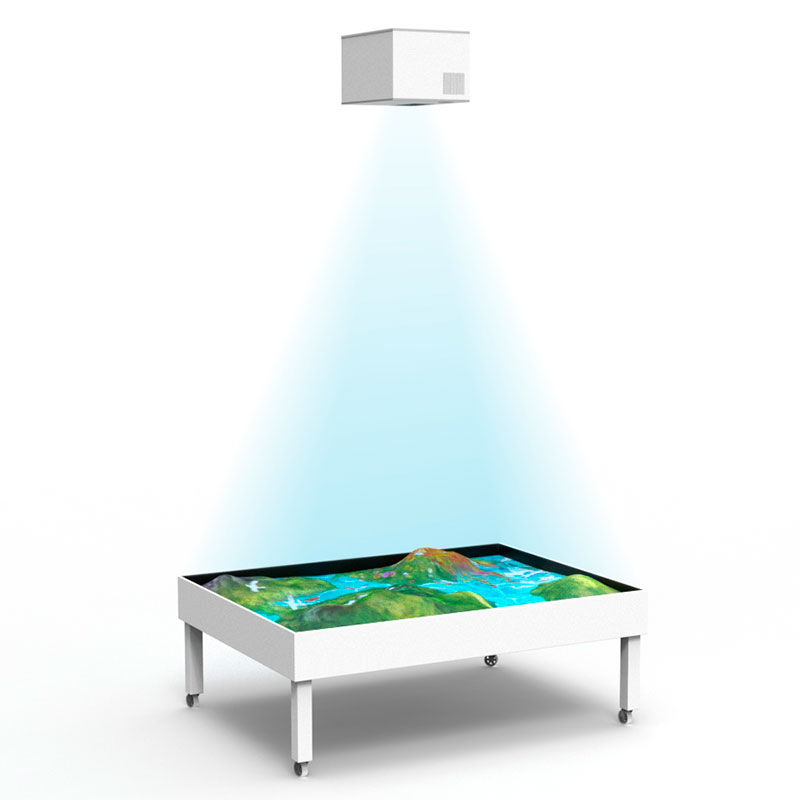 Уникальный комплекс, способствующий обучению детей через игру, развитию мелкой моторики, пространственного и творческого мышления, снятию стресса и расслаблению, незаменимый в работе учителей и психологов. ПО представлено большим количеством красочных сцен, уникальными режимами: "Викторина", "Изучение азбуки с дополненной реальностью", "Ожившие рисунки в песочнице" и "Интерактивный пляж в песочнице", а также удобным мобильным приложением. В зависимости от комплектации и дополнительного реквизита интерактивная песочница может легко превратиться в интерактивный пол, интерактивный стол, интерактивный пляж, интерактивно-проекционный маппинг-мультикомплекс. Оборудование располагается в металлическом боксе, размещенном на потолке, включает вычислительный центр, проектор, считывающую камеру глубины, ip/usb камеру. Под вычислительным центром устанавливается резервуар, заполненный песком/лечебной морской солью/водой (в зависимости от поставленной задачи), в который проецируется изображение.