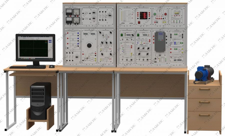 Комплект учебного оборудования предназначен для обучения студентов различных специальностей средних специальных и высших учебных заведений, изучающих дисциплины «Электрические машины», «Электрические машины и основы электропривода», «Электрический привод», «Системы управления электроприводов», «Теория электропривода». Позволяет изучить схемы пуска, рабочие свойства и характеристики машин постоянного тока, асинхронных и синхронных машин, трансформаторов, получить навыки программирования преобразователя частоты, настраивать и исследовать разомкнутые и замкнутые системы электроприводов постоянного и переменного тока. Комплект оборудования включает в себя электромашинный агрегат, который содержит машину постоянного тока, машину переменного тока и датчик скорости.