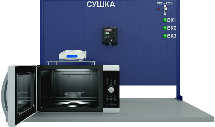 Изучение различных способов сушки влажных материалов. Перечень выполняемых работ на учебном стенде: - Измерение массы высушиваемого материала, времени сушки и температуры; Определение относительной влажности воздуха на выходе из сушильной камеры; Экспериментальное построение графиков скорости сушки при различных способах подвода тепла (конвекция, свч, ик излучение и их комбинации); Определение убыли влаги и программное определение скорости сушки; Определение затрачиваемой мощности при различных режимах сушки