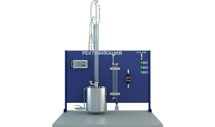 Учебный стенд используется в высших и средних профессиональных учебных заведениях; в учреждениях повышения квалификации специалистов. Предназначен для выполнения следующих работ: - Практическое изучение процессов химических производств на ректификационной колонне тарельчатого типа; - Определение флегмового числа; - Определение теплового баланса; - Определение КПД ректификационной колонны; - Изучение процесса ректификации многокомпонентной смеси в тарельчатой колонне; - Измерение расходов и температур на входе и выходе горячего и холодного теплоносителей.