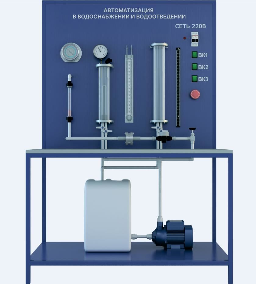 Предназначен для изучения приборов и устройств, принципов работы и автоматизированного управления используемых в процессах автоматизации в водоснабжении и водоотведении. Перечень выполняемых работ на учебном стенде: - Исследование характеристик потенциометрического датчика; - Изучение устройства электромагнитного реле и определение его характеристик; - Изучение устройства центробежного насоса и определение его рабочих характеристик; - Измерение расхода жидкости; - Изучение датчиков для измерения температуры и давления, исследование характеристик реле давления; - Исследование характеристик системы автоматического регулирования с регулированием по уровню; - Исследование характеристик системы автоматического регулирования с регулированием по давлению.