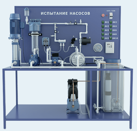 Изучение конструкций и испытание различных типов насосов. Перечень выполняемых работ на учебном стенде: - Ознакомление с конструкцией и испытание горизонтального центробежного насоса; - Ознакомление с конструкцией и испытание вертикального центробежного насоса; - Ознакомление с конструкцией и испытание погружного винтового насоса; - Ознакомление с конструкцией и испытание погружного мембраного насоса; - Ознакомление с конструкцией и испытание вихревого насоса; - Ознакомление с конструкцией и испытание шестереного насоса; - Ознакомление с конструкцией и испытание поршневого насоса; - Ознакомление с конструкцией и испытание перистальтического насоса; - Ознакомление с конструкцией и испытание импеллерного насоса.