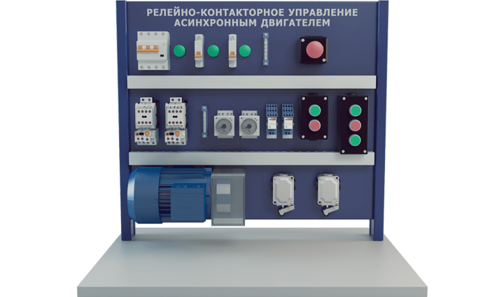 Стенд по изучению релейно-контакторных схем управления пуском, торможением, реверсом асинхронного двигателя с короткозамкнутым ротором. Исследование тепловой защиты двигателя, схем управления двигателем в функции времени, управление с использованием датчиков положения. Монтаж схем для выполнения работ осуществляется отвертками и проводниками из комплекта поставки. Перечень выполняемых работ на учебном стенде: - Изучение схемы тепловой защиты асинхронного двигателя на базе теплового реле- Изучение схемы прямого пуска асинхронного двигателя с короткозамкнутым ротором- Изучение схемы пуска асинхронного двигателя с пусковыми резисторами- Изучение схемы пуска асинхронного двигателя с пусковыми резисторами в функции времени- Изучение схемы прямого пуска, останова и реверса асинхронного двигателя с короткозамкнутым ротором
