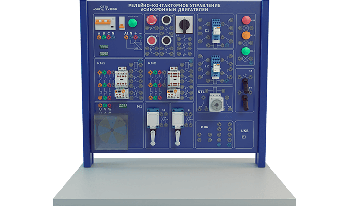 Изучение релейно-контакторных схем управления пуском, торможением, реверсом асинхронного двигателя с короткозамкнутым ротором. Исследование тепловой защиты двигателя, схем управления двигателем в функции времени, управление с использованием датчиков положения. Монтаж осуществляется проводниками из комплекта поставки с быстросъемными разъёмами типа «Банан». Измерение и отображение значений входного напряжения и тока, частоты вращения электродвигателя. Возможность интеграции стенда в практикумы по направлению "Автоматизация технологических процессов". Перечень выполняемых работ на учебном стенде: - Изучение схемы тепловой защиты асинхронного двигателя на базе теплового реле- Изучение схемы прямого пуска асинхронного двигателя с короткозамкнутым ротором- Изучение схемы пуска асинхронного двигателя с пусковыми резисторами- Изучение схемы пуска асинхронного двигателя с пусковыми резисторами в функции времени