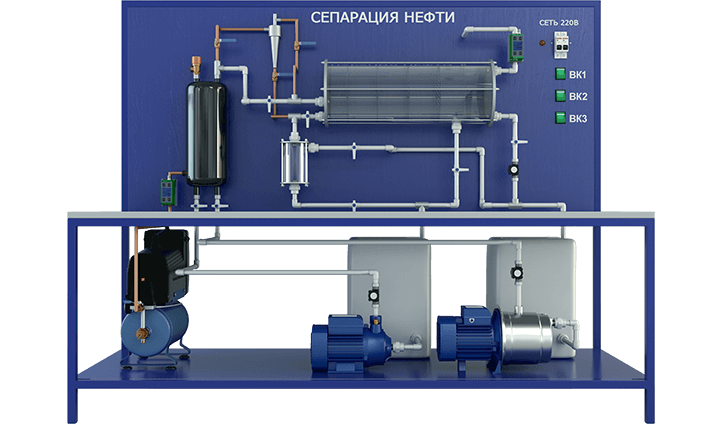 Установка предназначена для изучения процессов сепарирования Установка предназначена для изучения процессов сепарирования нефти и нефтепродуктов гидроциклонным и гравитационным методами с определением эффективных режимов очистки. Перечень выполняемых работ на учебном стенде: