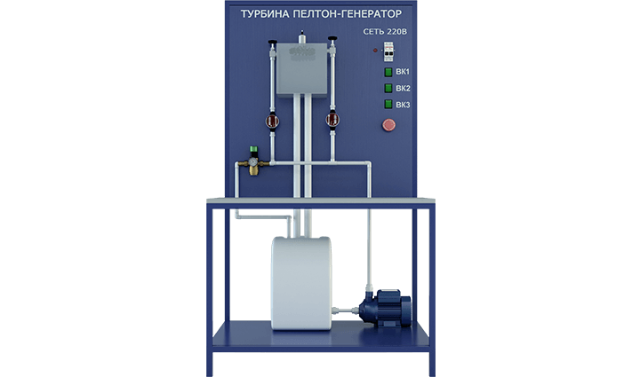 Изучение принципа работы и конструкции турбины Пелтона-генератор с измерением выходных параметров с генератора. Перечень выполняемых работ на учебном стенде: - Изучение конструкции турбины Пелтона.- Изучение конструкции генератора.- Испытание системы турбина Пелтона – генератор – нагрузка.- Исследование характеристик системы турбина Пелтона – генератор – нагрузка при работе с одним сопловым аппаратом и двумя.- Изучение способов коммутации нагрузки и исследование процесса изменения потребляемой мощности при различных схемах включения нагрузки.- Изучение способов включения генераторов