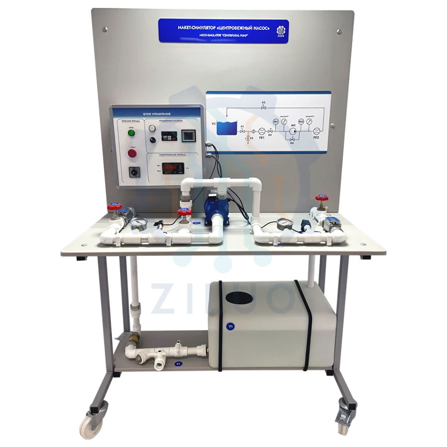 Лабораторная установка предназначена для изучения устройства и принципа работы центробежного насоса, а также для определения основных рабочих характеристик центробежных насосов, используемых в системах водоснабжения и водоотведения. Оборудование позволяет снимать напорно-расходные характеристики насоса и насосной станции на базе комбинации насосов, задавать и определять давление и расход жидкости в различных точках гидросистемы. Установка представляет собой размещенные на мобильном основании набор функциональных модулей, секций, панелей, оборудования и деталей действующей гидравлической системы, электрические блоки управления, элементы автоматики и защиты. В состав входит комплект учебных материалов.