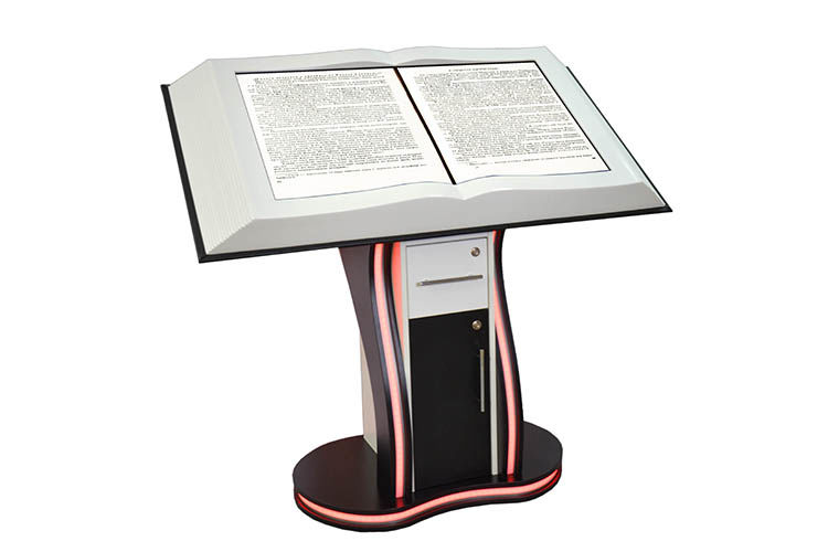 Мультимедийная интерактивная книга «AVKompleks» на стационарной опоре представляет собой оборудование для представления наглядной информации в любых организациях, где в этом есть потребность. Это могут быть музеи, библиотеки, выставки, образовательные заведения, медицинские учреждения.Декоративный корпус из МДФ и ЛДСП выполнен в виде основания с лежащей на нем открытой книгой. Оборудование мобильно за счет колесиков в основании, что позволяет легко его перемещать при необходимости. Дизайн оборудования хорошо впишется в интерьер актового или выставочного зала, вестибюля или приемной.