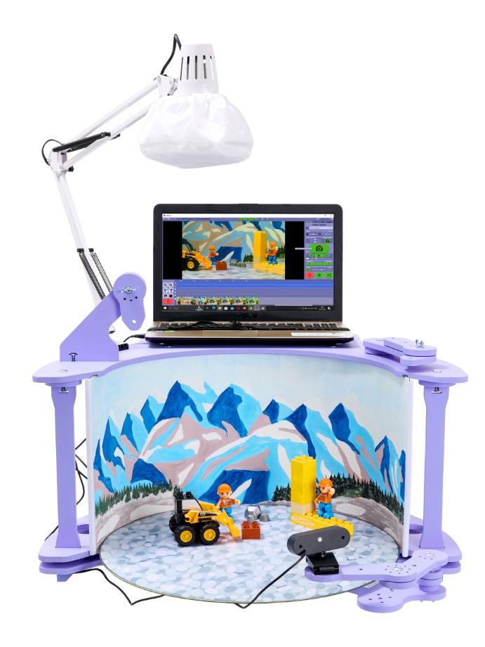 Мультстудия Проф - версия для кукольной анимации, это гармонично организованное пространство со сменными фонами, местом установки ноутбука, поворотной сценой, множеством рычагов и кронштейнов для расположения постов съемки и размещения героев. В состав обязательно входит веб-камера, лампа, фоны, набор для творчества, авторские методические пособия, программное обеспечение АртИгрушка и обучающий видео курс. Возможна комплектация дополнительным тематическим конструктором и/или дидактическим набором с героями (версия расширенная 2/3/4 или 5, версия "Юный мультипликатор" и ее варианты 2/3/4 или 5).