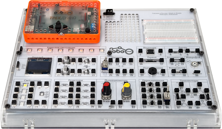 Образовательный комплекс по изучению основ электроники и электротехники, микропроцессоров и программирования электронных устройств «Роботрек Электротехника» предназначен для проектной деятельности и обучения детей и подростков основам электроники и электротехники, микропроцессоров и программирования электронных устройств. Позволяет собирать электрические схемы, программировать умные системы, работать с датчиками и моторами, а также разрабатывать интерактивные проекты, развивая инженерное мышление и навыки работы с современными технологиями. Образовательный комплекс включает монтажный столик и дополнительные компоненты.Монтажный столик предназначен для упрощения сборки электронных схем. Он дает возможность собирать и тестировать их без пайки соединений. Для сборки схем необходимо просто вставить клемму провода в разъем, соединяя контакты. Такой способ соединения проводов абсолютно безопасен, прост и понятен.