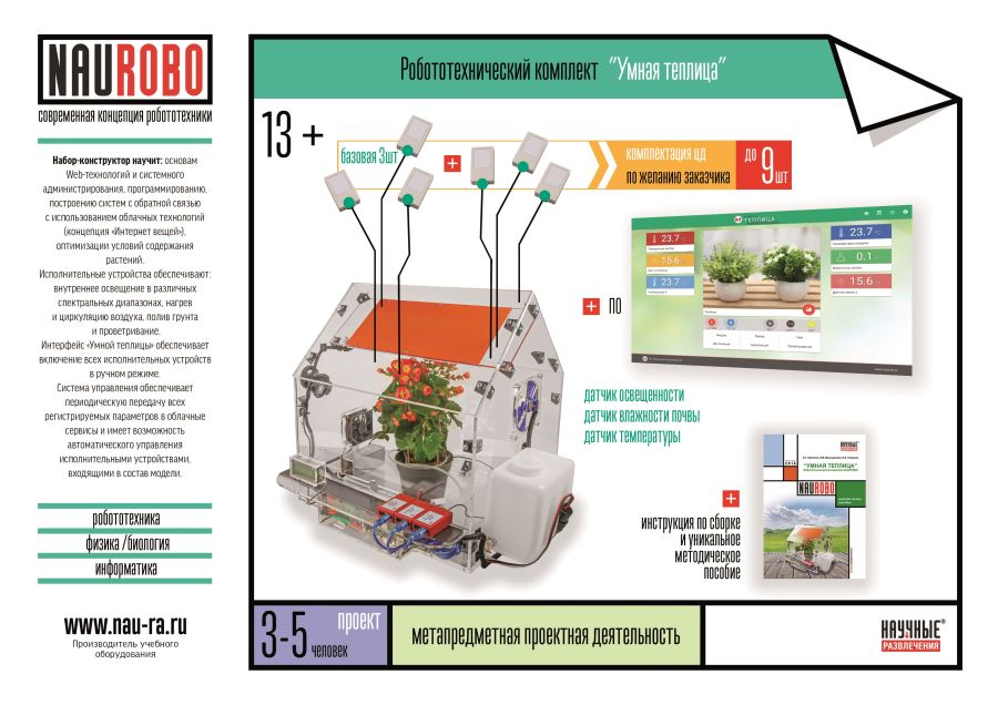 Робототехнический комплекс представляет собой набор-конструктор по сборке модели умной теплицы с роботизированной системой управления, объединяющий в себе следующие задачи: механическая сборка корпусных элементов, монтаж электрических схем, применение датчиков для контроля параметров внутренней среды и созданию алгоритмов автоматического управления этими параметрами (в частности, температурой, влажностью почвы, освещенностью) с целью выращивания биологических культур, программирование на JavaScript с использованием фреймворка NodeJS (+HTML и CSS), изучение влияния на рост растений температуры, влажности почвы и освещенности.
