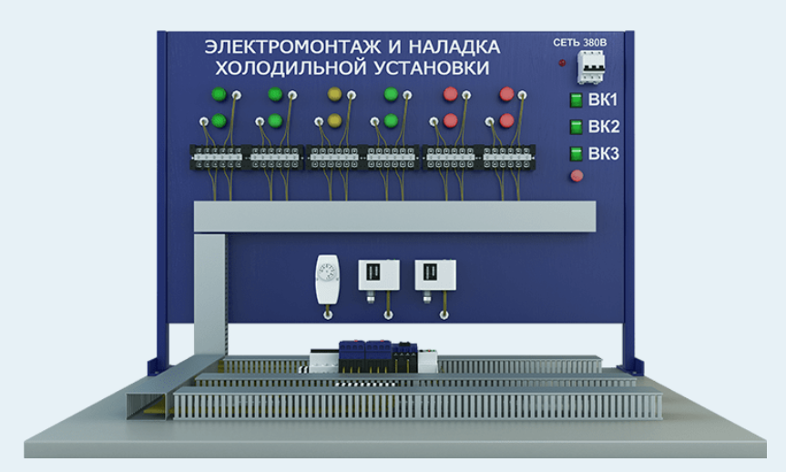 Предназначен для отработки практических навыков по электромонтажу и наладке систем управления холодильных установок. Перечень выполняемых работ на учебном стенде: - Наладка и регулировка схемы автоматического управления; - Разработка принципиальных электрических схем холодильных установок; - Сборка и настройка пускозащитной аппаратуры; - Исследование, регулировка и настройка тепловых реле; - Исследование технического состояния заземляющих устройств и проверка цепи «фаза-нуль»; - Изучение эксплуатации электродвигателей в сетях трехфазного питания; - Наладка асинхронного короткозамкнутого электродвигателя после монтажа