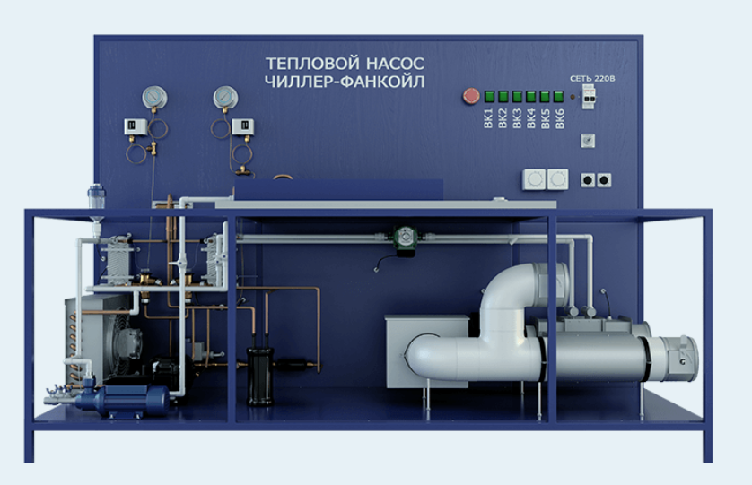 Предназначен для обучения по проектированию, эксплуатации и сервисному обслуживанию теплового насоса с системой кондиционирования воздуха. Перечень выполняемых работ на учебном стенде: - Испытание холодильной установки в режиме охлаждения. Определение холодильного коэффициента; - Анализ термодинамических циклов работы холодильной машины. Определение холодопроизводительности. Построение цикла работы в заданном режиме; - Испытание холодильной установки в режиме теплового насоса по схеме воздух - вода. Определение отопительного коэффициента; - Испытание холодильной установки в режиме теплового насоса по схеме вода - вода. Определение отопительного коэффициента; - Проектирование холодильной установки и проверка результатов на действующем стенде; - Экспериментальное изучение устройства и работы линейной холодильной автоматики
