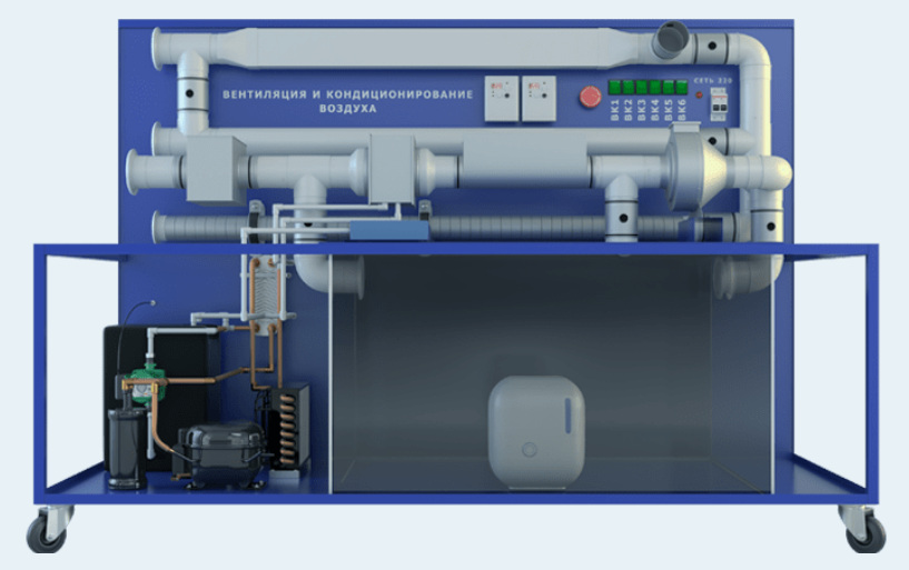 Предназначен для подготовки и проведения чемпионатов и демонстрационных экзаменов по компетенции «Холодильная техника и системы кондиционирования». Перечень выполняемых работ: -Диагностика и устранение неисправностей по электрической части, в холодильном контуре и в контуре циркуляции воздуха; -Составление схем вентиляции и кондиционирования с определением характеристик оборудования; -Исследование характеристик гладкого воздуховода (трубопровода) круглого и прямоугольного сечений; -Исследование характеристик гофрированного воздуховода (трубопровода) круглого сечения; -Исследование потерь напора; -Исследование характеристик сети при последовательном и параллельном соединении трубопроводов; -Определение холодопроизводительности, построение цикла работы в заданном режиме; -Монтаж малой фреоновой холодильной установки; -Испытание водоохлаждающей установки (чиллера); -Испытание смешанной схемы с большими влагопритоками без использования калорифера- Исследование эпюр распределения скоростей