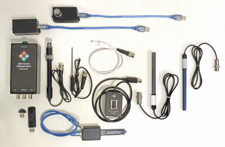 В состав входит автономный беспроводной мультидатчик со встроенными цифровыми датчиками (8 штук), датчик звука, датчик влажности почвы, датчик окиси углерода, мультидатчик оптической плотности и мутности растворов, программное обеспечение, зарядное устройство, USB-адаптер BLUETOOTH 4.1LE, упаковка, методическое пособие, паспорта на мультидатчик, лабораторные работы в печатном виде. Данные, снимаемые датчиками лаборатории, при помощи специального программного обеспечения, используются в учебном процессе средней общеобразовательной школы для демонстрационных целей. Мультидатчик из состава лаборатории позволяет проводить эксперименты и опыты по всему курсу экологии средней общеобразовательной школы.