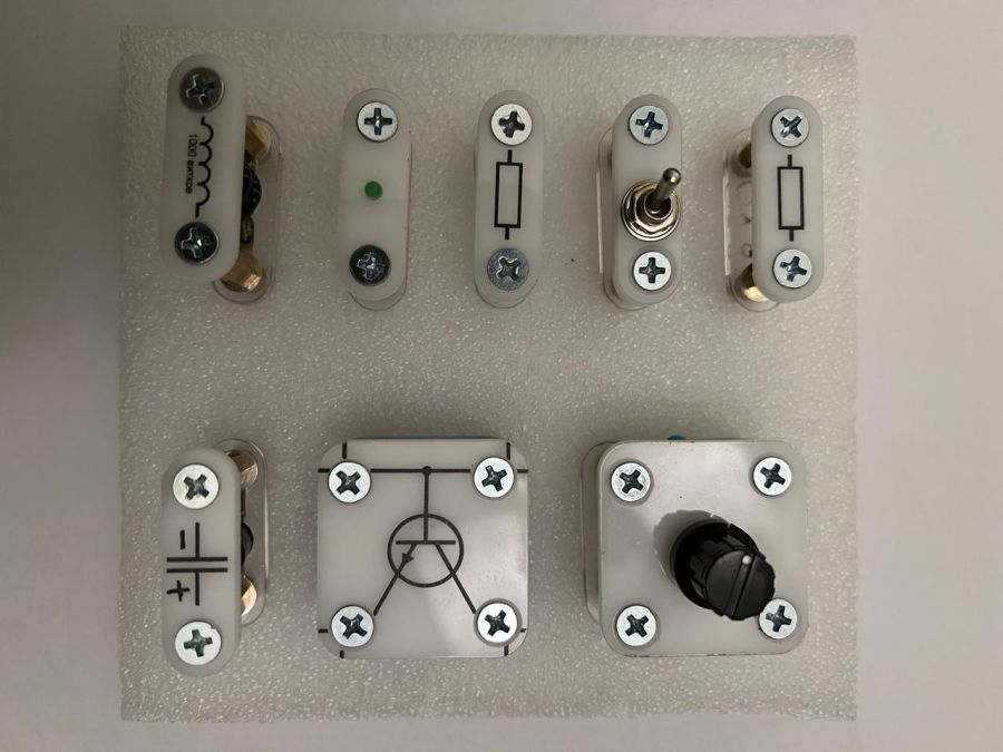 Комплект включает в себя не менее 40 элементов для решения следующих задач: Снятие вольтамперных характеристик выпрямительных диодов; Снятие вольтамперных характеристик диодов Зенера (стаблилитронов); Снятие вольтамперных характеристик светодиодов (LED); Выпрямление переменного напряжения с помощью диода, сборка диодного моста; Стабилизатор напряжения на диоде Зенера; Изучение полярности светодиодов; Изучение биполярных транзисторов; Снятие вольтамперных характеристик транзистора; Снятие вольтамперных характеристик полевого транзистора; Транзистор как усилитель/переключатель; Генератор синусоиды на транзисторе (колебательная система); Транзистор как функциональный генератор; Полевой транзистор как усилитель/ переключатель. Для проведения работ рекомендуется наличие: -мультиметров, 2 шт.;-Функционального генератора;-Осциллографа с соединительным кабелем.
