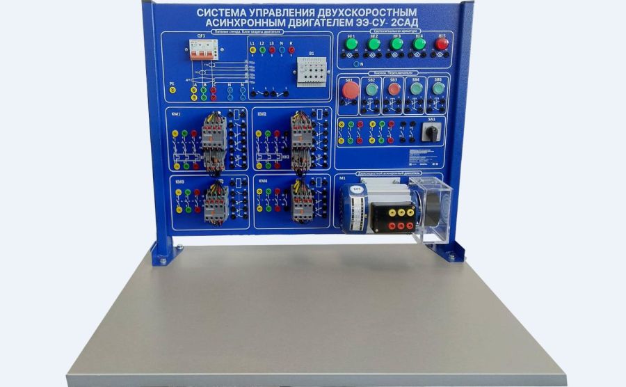 Предназначен для практического изучения систем управления двухскоростным асинхронным двигателем переменного тока, монтажа и наладки схем пуска, останова и реверса двигателя, изучения работы микропроцессорного блока управления (МПБУ) и защиты двигателя. Перечень выполняемых работ на учебном стенде: - Сборка и наладка схемы пуска и торможения; - Сборка и наладка схемы пуска, реверса и торможения; - Сборка и наладка схемы тепловой защиты двигателя с использованием электротеплового реле; - Программирование микропроцессорного блока управления и защиты; - Сборка и наладка схемы тепловой защиты с использованием МПБУ; - Сборка и наладка схемы защиты от обрыва фазы с использованием микропроцессорного блока управления; - Сборка и наладка схемы «треугольник — двойная звезда» в режимах пуска и торможения; - Сборка и наладка схемы «треугольник — двойная звезда» в режимах пуска, реверса и торможения; - Сборка и наладка схемы пуска и торможения с помощью пакетного переключателя (схема Даландера).